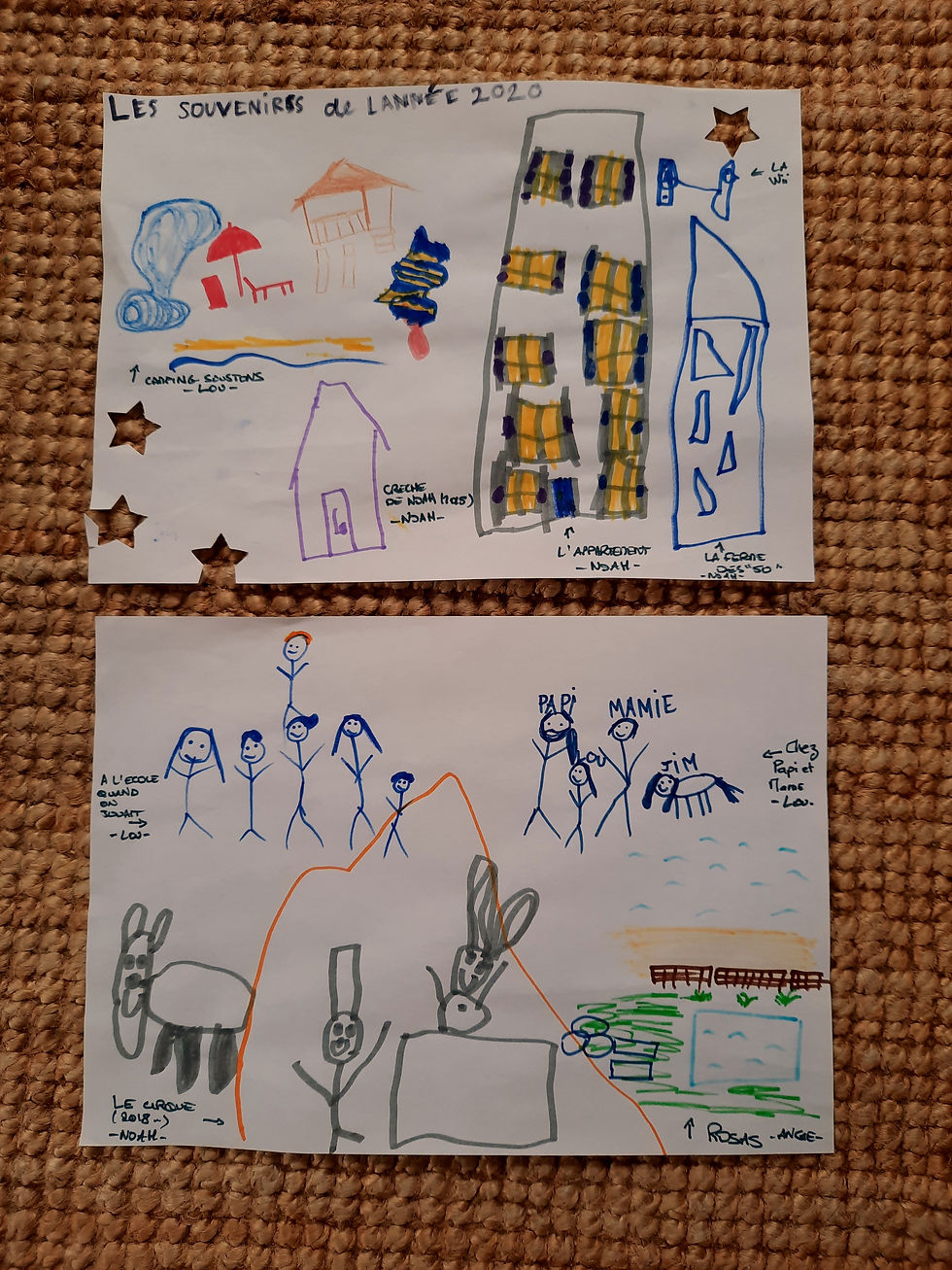 Non, le 1er janvier, on a décidé, tous les 3, de se souvenir du meilleur. C'est ce que l'on a dessiné, à tour de rôle, sur ces feuilles. (On dépassera la "qualité" de cette œuvre d'art pour se concentrer sur le fond. Oui je sais je suis nulle en dessin mais tant pis ☺ ).