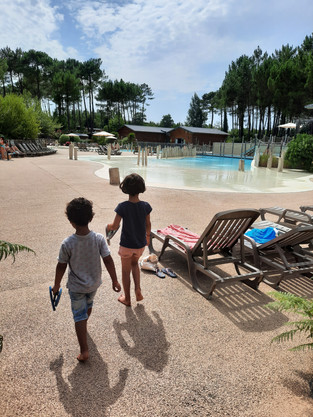 Notamment les vacances de cet été au "camping". Si on avait pu les dessiner tous les 3 sur cette feuille, on l'aurait fait. Ces 5 petits jours, ces 3h30 de route, c'était nos premières vacances tous les 3. Après le confinement, après l'enfermement et après la séparation, c'était NOTRE moment. Pas vraiment planifié (pour une fois, moi qui habituellement prévois tout !). J'avais envie de partir. Prendre l'air. Me/nous dépayser. Se retrouver mais ailleurs qu'entre nos murs, nos devoirs (oui je choisis bien ce mot !) respectifs. J'avais choisi cette formule, un confortable chalet et cet endroit parce que j'avais envie de beau. De calme. De simplicité. De voir des gens (mais pas trop). Parce que cet endroit m'inspirait le bien-être et promettait d'offrir des moments de plaisirs aux petits comme aux grands. Parce qu'au-delà, les prix s'envolaient aussi c'est vrai (déjà que …). Et cet endroit a tenu ses promesses. Je dirais presque "luxe, calme et volupté" (oui on a toujours des enfants hein ☺). Pas de voiture mais des voiturettes, une piscine-lagon extérieure magnifique, une intérieure chauffée (oui c'est pratique lorsqu'il fait plus frais), l'océan et le lac de Soustons à quelques kilomètres. Deux chambres et un salon. Une jolie terrasse en bois. Des espèces végétales répertoriées dans les allées. Un souci du détail. Des activités pour les enfants etc. Devinez quoi : "Maman on pourra retourner au camping cet été !!! ". Tout est dit. Merci Soustons Village ! (Ils n'ont rien à gagner … ni moins non plus d'ailleurs en les citant).