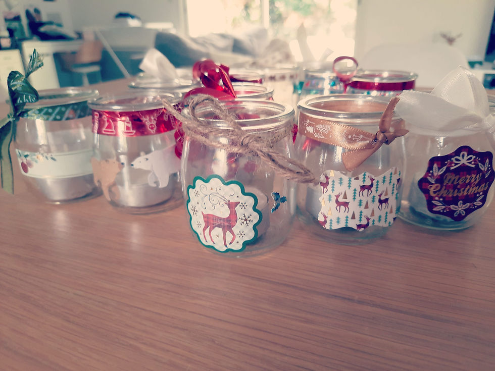 Le lendemain, cela avait été au tour des « châteaux-forts » (les photophores selon N.) Cela avait commencé à se corser avec des étiquettes revêches, du bolduc qui ne « voulait » pas faire de jolis nœuds, des « juste deux gommettes, plus ça ne sert à rien ! », « je prends le Père Noël puisque vous n’arrivez pas à vous mettre d’accord sur celui qui le prend ! », des tentatives de calmer L. « ahhhhh mais ça commence à m’énerver cette colle qui ne colle pas, c’est nul ! » … Bref, ça se gâtait. Lui collait pour coller, elle, elle s’appliquait comme toujours … Mais au final, malgré les chamailleries, les râleries, les autocongratulations aussi, un petit « à qui je vais l’offrir ? » a émergé.